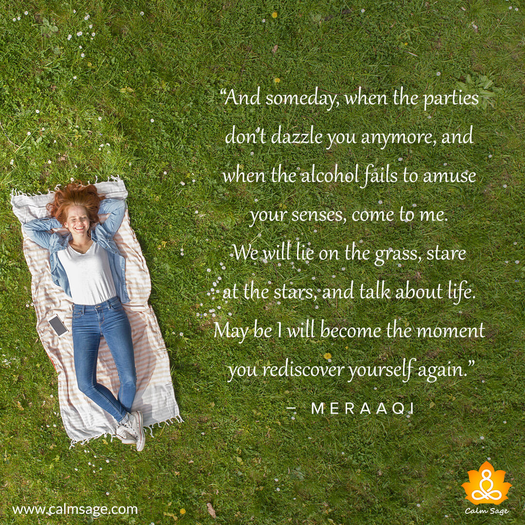 “And someday, when the parties don’t dazzle you anymore, and when the alcohal fails to amuse your senses, come to me. we will lie on the grass, stare at the stars and talk about life. May be I will become the moment you rediscover yourself again.”